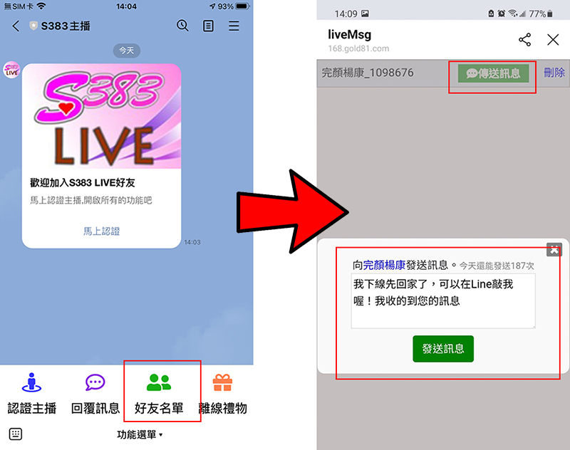 在S383主播下方列表選擇:好友名單,按下客人的傳送訊息即可