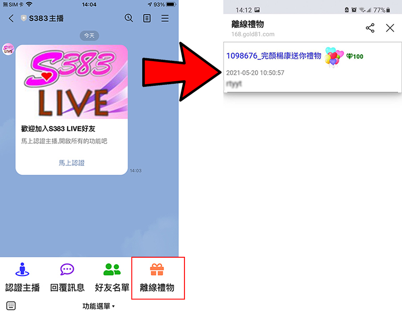 離線禮物功能,可顯示客人透過LINE送禮的列表。
